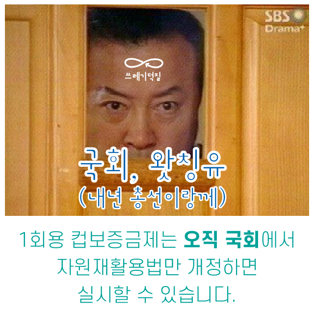 2017년 환경부가 실시한 설문조사에 따르면, 89.9%의 시민들이 컵보증금제에 찬성했습니다. 또한 2018년 초부터 환경부도 1회용 컵보증금제를 실시할 예정이라고 공식적으로 밝혀왔습니다. 그러나 이 법을 개정해야 하는 국회 환경노동위원회에서 "1회용품은 불가피"하고 "텀블러는 더럽고", "이런 것 하는 나라가 어딨냐"며 법 개정을 미루고 있습니다.