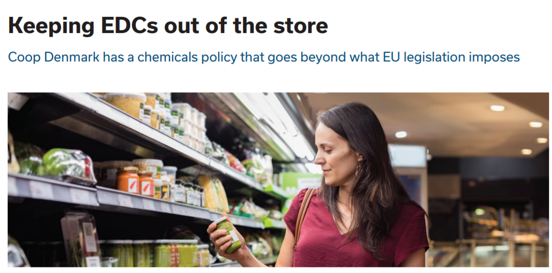 덴마크의 가장 큰 대형마트 체인인 쿱 덴마크에서 자사 매장에서 판매하는 상품에서 환경호르몬(내분비계 장애물질, EDCs)를 금지한다고 발표했다. 결코 쉬운 결정은 아니었다. 쿱 덴마크의 품질 관리 매니저인 Malene Teller Blume는 “공급업체가 유럽연합 화학물질 규제보다 앞서 나간 쿱 덴마크의 정책을 이해한 것은 아니다”라고 말했다.