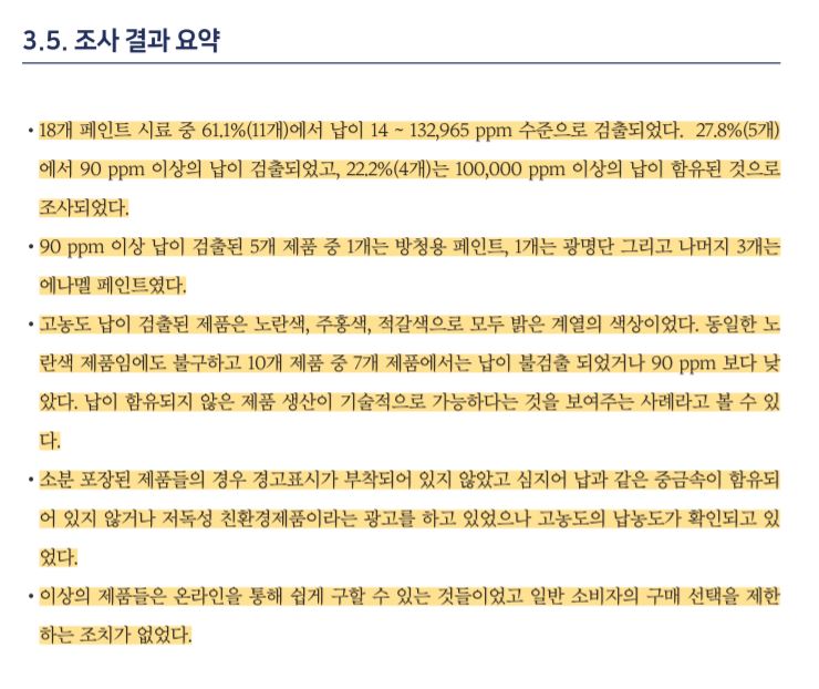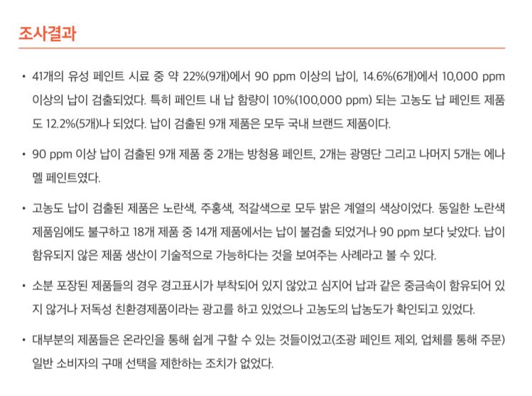 그렇다면 답은 무엇일까요? 바로 국제 수준에 맞는 페인트 납 규제로 기준을 높이고, 페인트 회사는 납이 들어가지 않는 안전한 제품을 생산하는 것입니다. 그리고 이미 많은 제품들이 납을 넣지 않고도 질이 좋은 페인트를 생산하고 있습니다.