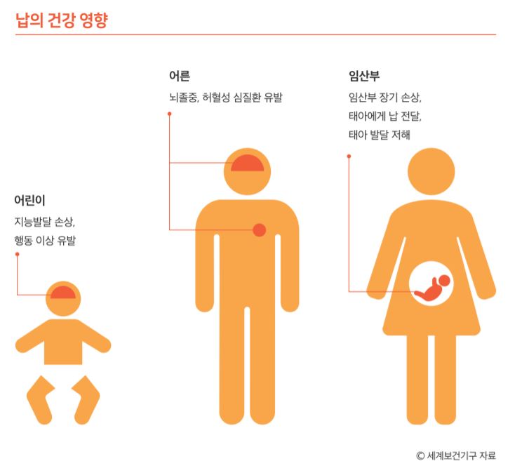 - 납은 중추신경, 뇌, 혈액체계, 신장, 간, 뼈, 생식기능을 해칩니다. 특히 어린이의 경우 납에 노출되면 되돌리기 힘들거나 평생 지속되는 건강영향을 입을 수 있습니다. 세계보건기구(WHO)는 납을 '어린이의 지능발달을 저해하는 물질'로 지정했고, 납 노출로 인한 정신 지체를 10대 어린이 환경질병 중 하나라고 밝혔습니다.