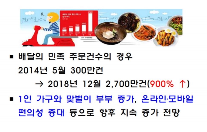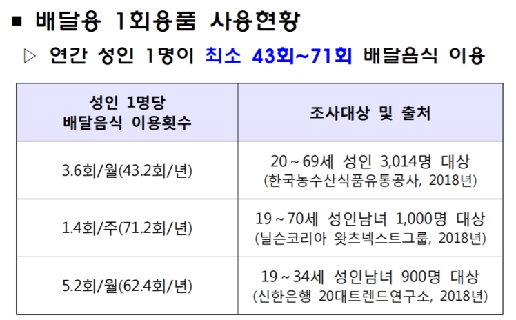 현재 배달음식 사업은 승승장구하고 일회용품 증가도 승승장구하는 중이다. '일회용품을 시켰더니 음식이 왔더라' 수준인데 전체 20조 규모에, '배달의 민족'의 경우 2014년도에 비해 900배 폭풍 성장!