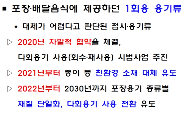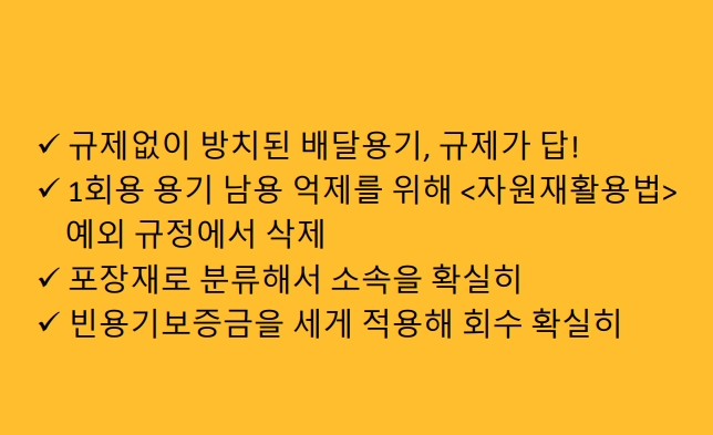 - 1회용품 예외 규정을 삭제하거나 줄여 배달용기가 빠져나갈 구멍을 없애기