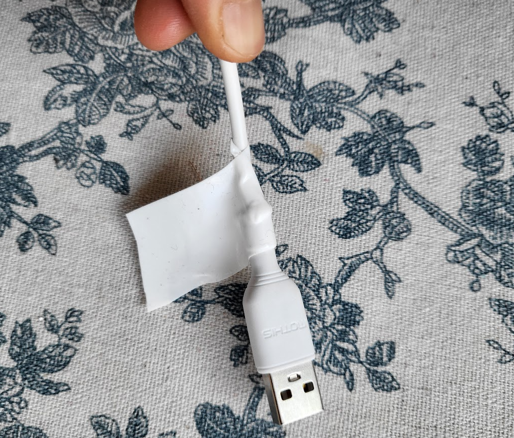 이렇게 끊어질랑말랑 할 때 그냥 두면 케이블 망가져서 버려야 하는데, 그 전에 자기융착 테이프로 감아주면 파손을 예방할 수 있다.