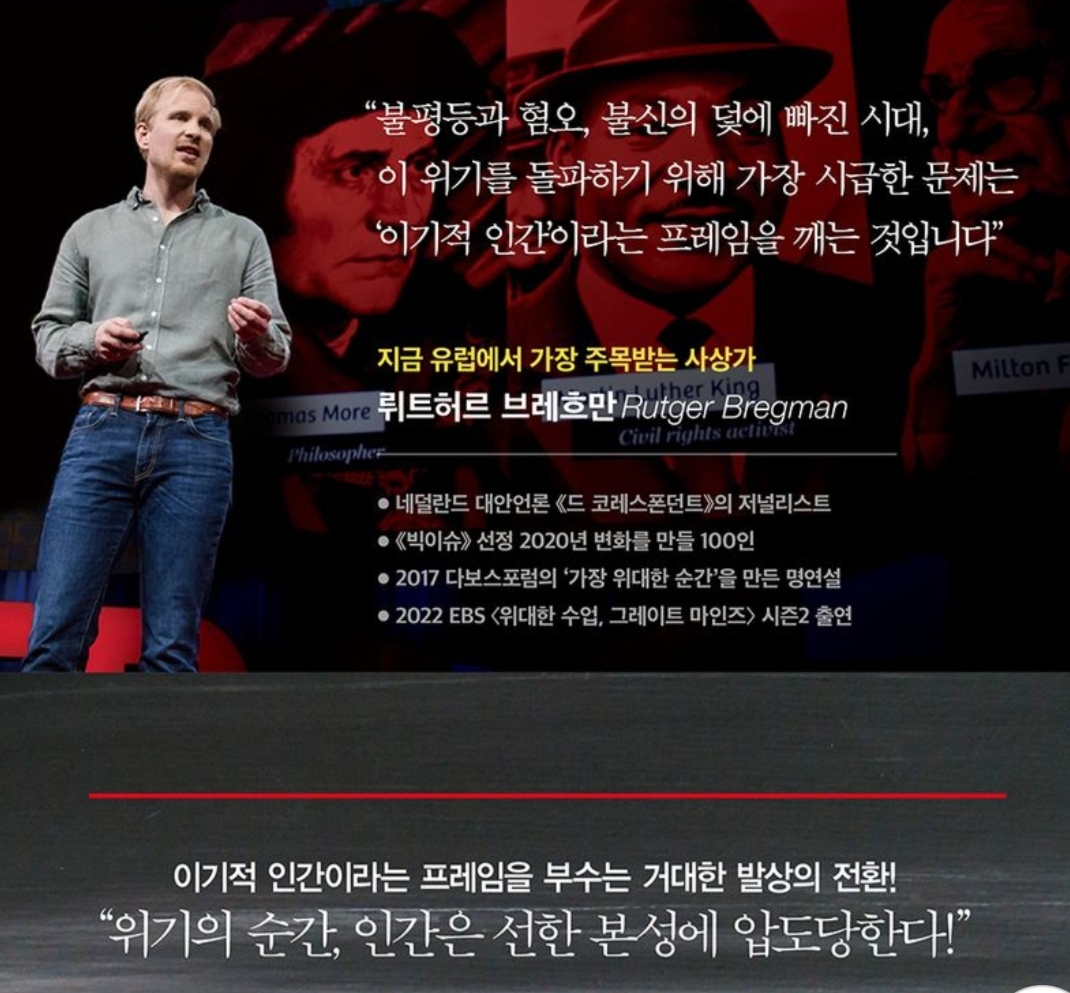 인간의 본성이 악하고 권력을 탐한다고 생각되는 유명한 교도소 실험이나 식인까지 일삼으며 멸망했다고 일컬어지는 이스터 섬의 비극을 재조명해서 그 이면의 진실을 알려준다. 그가 들이대는 증거가 바로의 인류 희망의 역사 그 잡채. 그렇다고 순진해 빠졌냐, 교회 오빠 같은 선한 목지자 같은 소리를 늘어놓냐면 전혀 그렇지 않다. 그는 매우 현실적이고 우파와 좌파를 가로질러서 더 좋은 사회를 구체적으로 찾아내는 언론인이다.